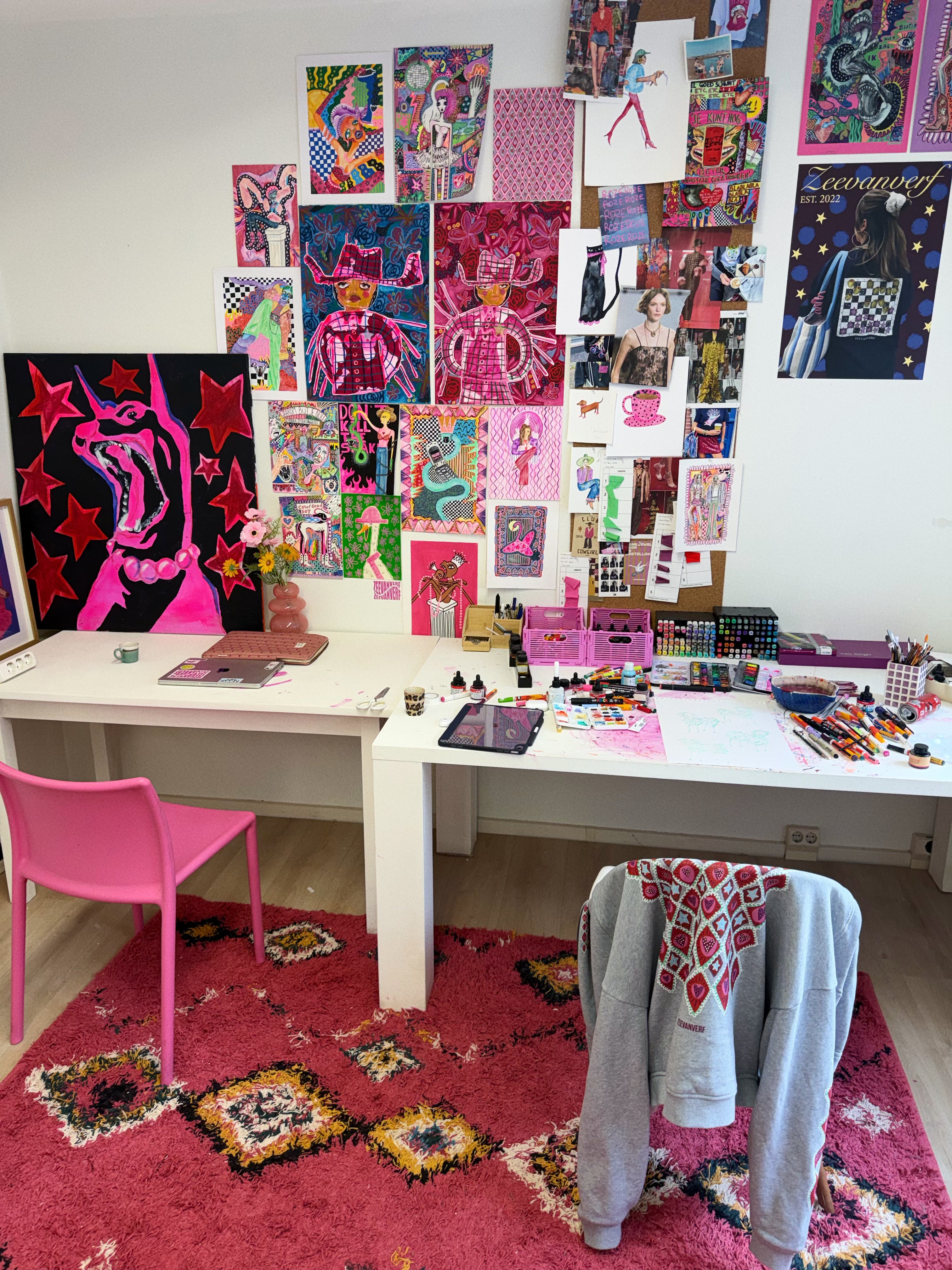 Welkom in het Atelier van Zeevanverf. Een plek waar ideeën op papier een eigen leven gaan leiden en kleuren zich nergens aan houden.