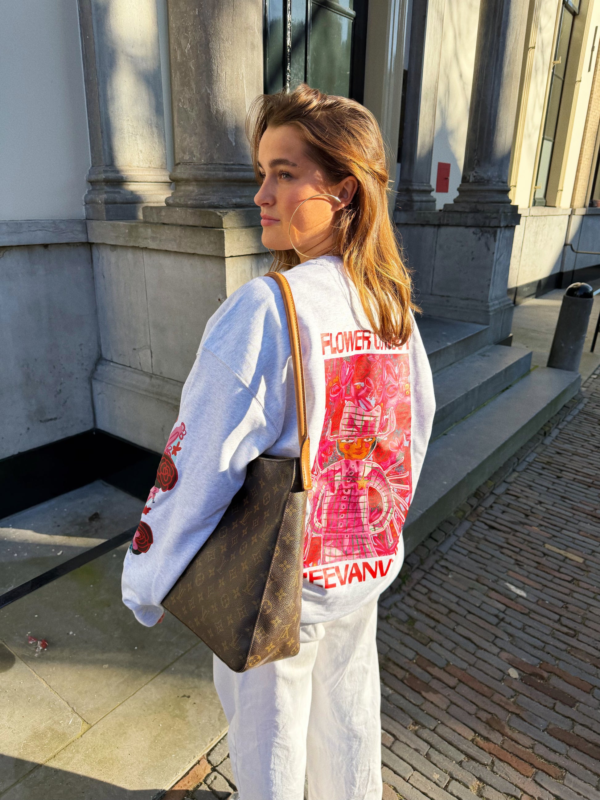 Lichtgrijze oversized sweater met op de rug een schildering van een 'Flower Cowboy'. Op de mouwen staan vrolijke bloemen en op de borst staat 'Zeevanverf'. Deze sweater is gemaakt van 100% katoen!De modellen dragen maat M.