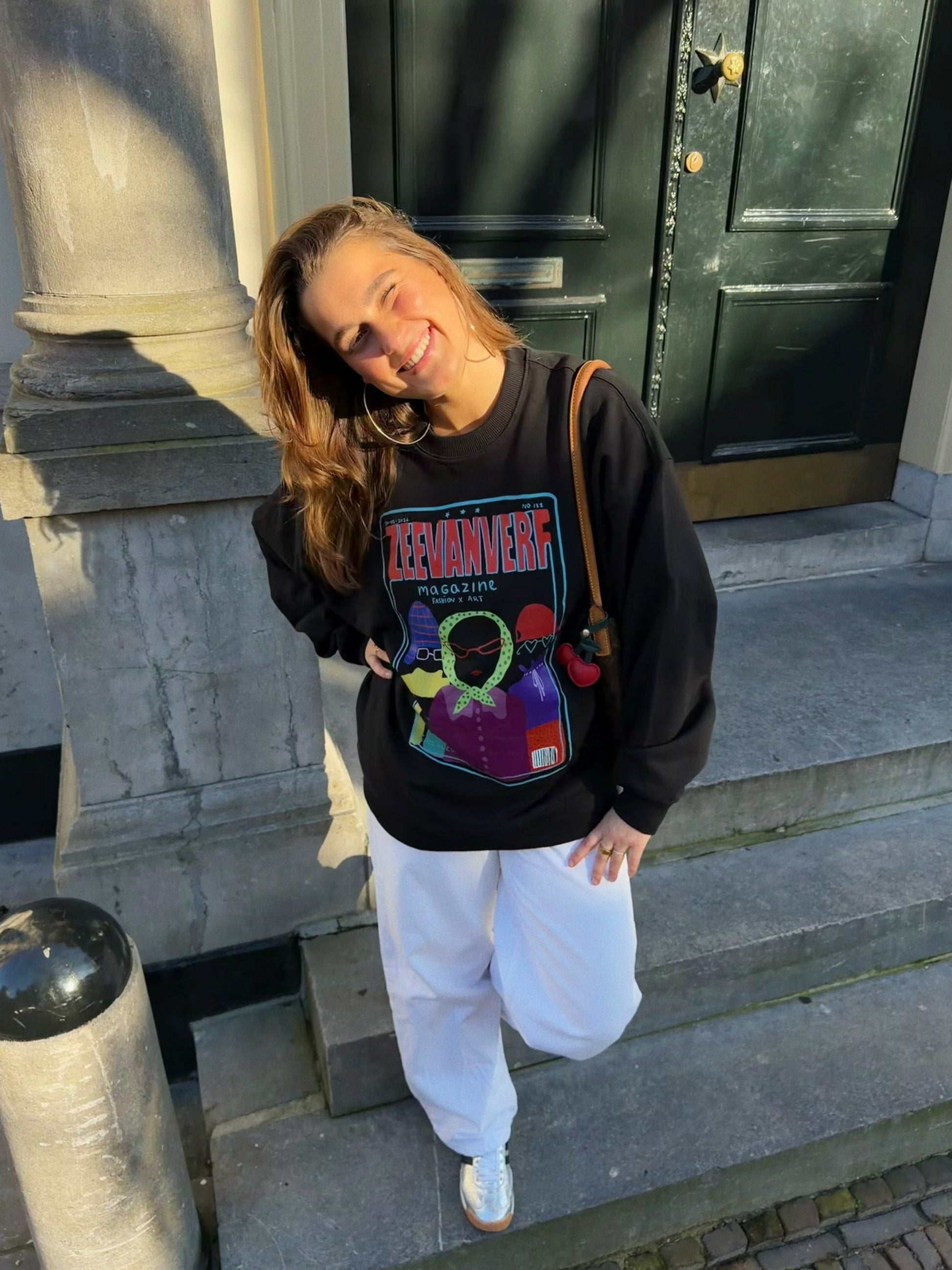 Zwarte oversized sweater met op de voorkant een abstracte tekening van een Zeevanverf magazine. Op de rug staat niets. Deze sweater is gemaakt van 100% katoen! De modellen dragen maat M.